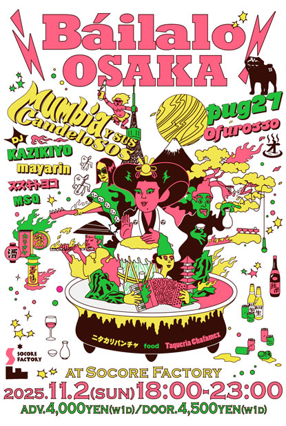 18:00-23:00 ADV 4000YEN (w/1D) DOOR 4500YEN (w/1D) ●LIVE Mumbia Y Sus Candelosos pug27 Ofurosso ●DJ KAZIKIYO mayarin スズキトヨコ MSQ ●FOOD ニタカリバンチャ Taqueria Chafamex “民謡クルセイダーズ”のパーカッショニストMuupy率いるハイブリッドCumbia Latinバンド“Mumbia Y Sus Candelosos”が、唯一無二のLatinサウンドにさらに磨きをかけ大阪に帰ってくる!会場はSOCORE FACTORY。